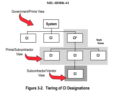 It is often believed that a CI is only used between the customer or end user and the top-level contractor. This is far from the truth. Most A&D contracts require that configuration management requirements levied on the 1st tier supplier be flowed down to 2nd tier suppliers. 2nd tier suppliers in turn flow them down to 3rd tier suppliers and so forth. The fact that 1st tier supplier is not aware that a 3rd or 4th tier supplier is using CIs does not negate their existence. MIL-HDBK-61A explains in Figure 3-2 just this tiering of CI designations.