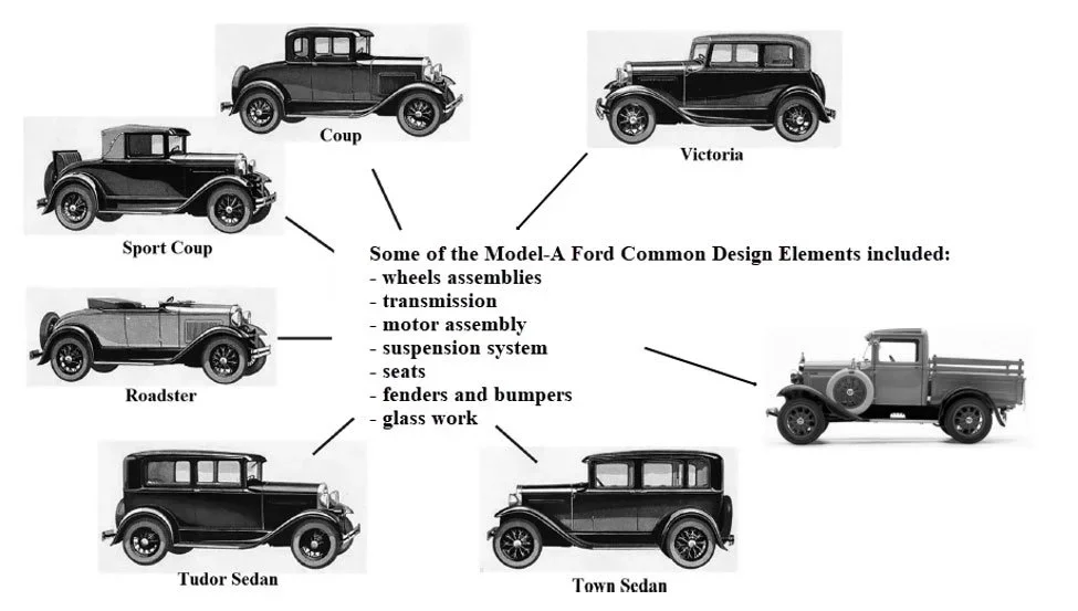 Sooner or later every A&D contractor, big or small, will face the need to address technical requirements and financial risks related to common design. Common design is simply a single design element (e.g. part or assembly) that is used across multiple applications or platforms. Typically, a solitary product group owns the design and controls its evolution. A product line family may have multiple common design parts in it. A single model in a product line sub-family may also have common design parts that are unique to that model only like the spare tire placement on the Model-A pick-up below.