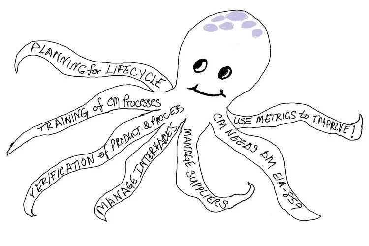 Why the shared ownership some may ask? The days when CM was limited to engineers managing engineering changes over hardware releases are long gone given the range of products, assets, records, documentation, and processes that should be under configuration control to avoid disasters. A previous CMsights post made the case that the Deepwater Horizon accident was fundamentally a failure of management to understand all that must be synchronized under configuration control, including operator training manuals, installation records, and service documentation. When I conduct training, students are often shocked at the reach of the ‘CM Octopus’ as I like to call it, with apologies to cephalopods.