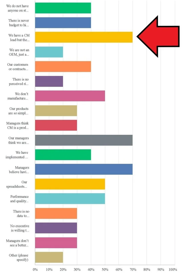 In a recent post we explored the obstacles to Getting Managers to Care About Configuration Management then asked readers for their own experience of making CM more important. As you can see from the below survey response chart, the top responses cited by readers can all be traced to misconceptions that managers have about the CM function but which CM Champion can remedy.