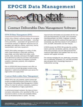 This CMstat product datasheet provides an overview of the EPOCH DM software product used for Contract Deliverables Data Management, including CDRLs and SDRLs.