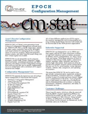 This CMstat product datasheet provides an overview of the EPOCH CM software product used for Asset Lifecycle Configuration Management and Hardware Configuration Management.